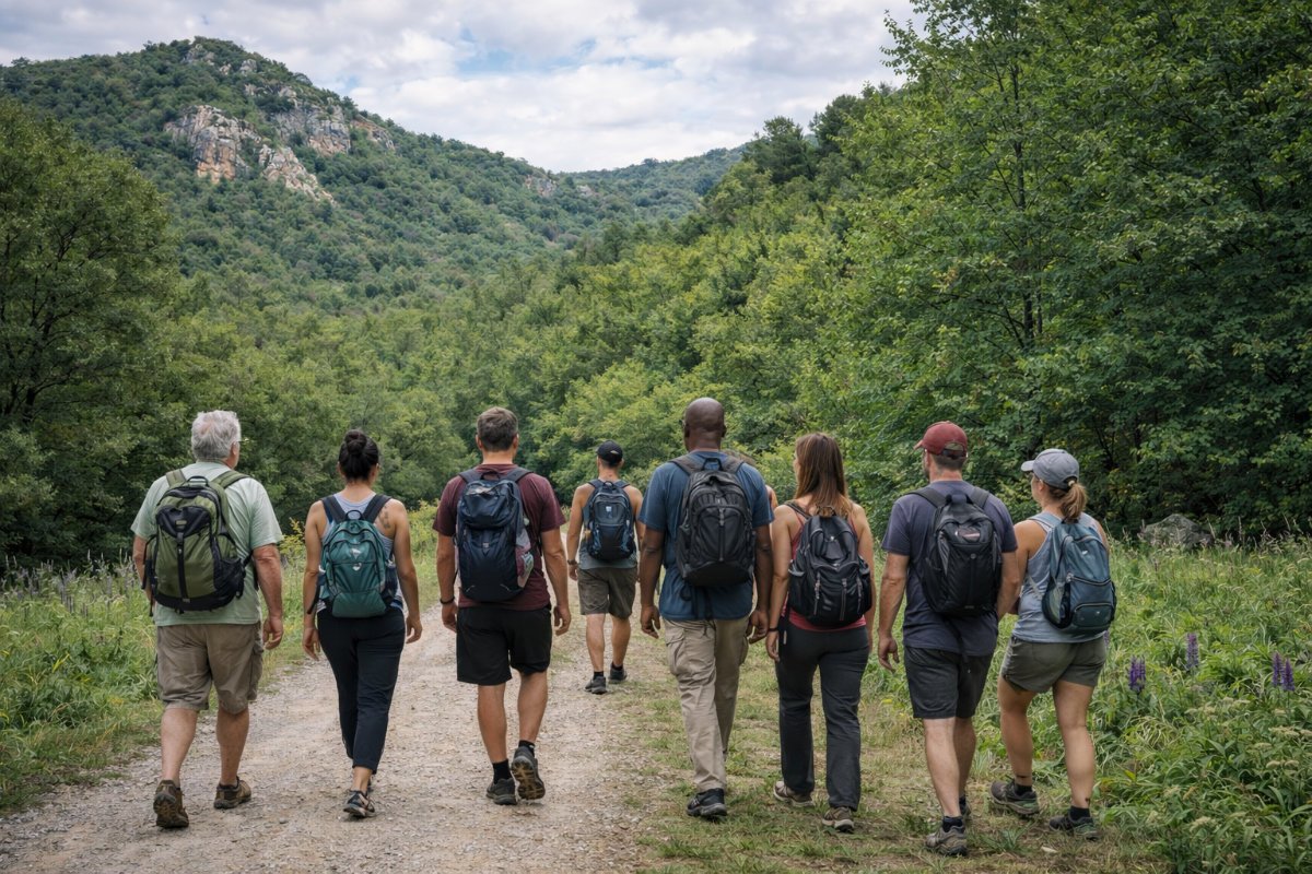 Group walks in nature and other outdoor activities with quiet moments, followed by casual conversation.